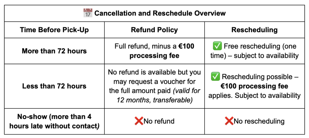 -Rescheduling your reservation is possible within the 72-hour time period, but please note that a €100 processing fee will apply as such a last-minute modification can disrupt our fleet schedule and limit our ability to rebook the original slot.